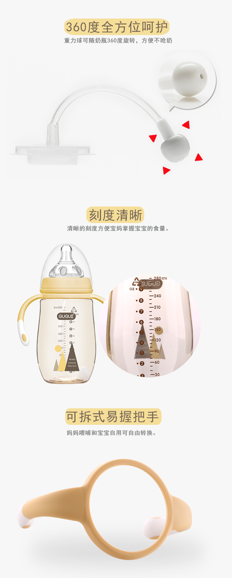 顏 色:都市灰/典雅黃/簡約白 材 質(zhì):PPSU(奶瓶瓶身呈淡茶色)